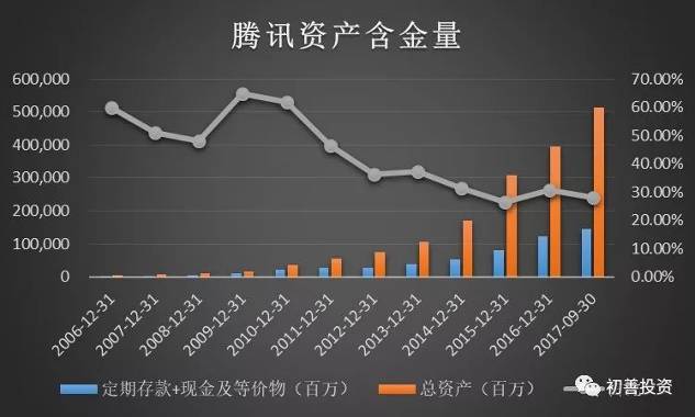 至于说钱的方面,强悍的腾讯也不缺钱。因为腾讯是的主营业务是广告和游戏,在收入确认上,存在当期收款而分期确认收入的情形。因而腾讯的现金流也很强。这可以体现为腾讯的定期存款和现金在对外投资扩张的2011年以前,存款和现金合计一直占资产的50%以上,哪怕开始对外投资了,近几年的货币资金占比也都维持在30%左右。如图6-47所示。