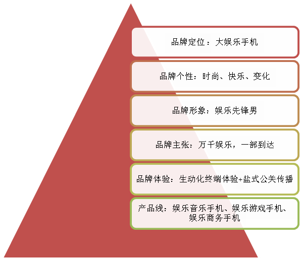 基于对消费人群的分析、对万利达手机自身资源的审视以及对这个全民大娱乐时代的洞察,经过几次创意采纳与万利达移动达成共识,确定了万利达手机品牌核心规划金字塔(如图9-1所示),将把万利达手机打造成最有娱乐精神的大娱乐手机。