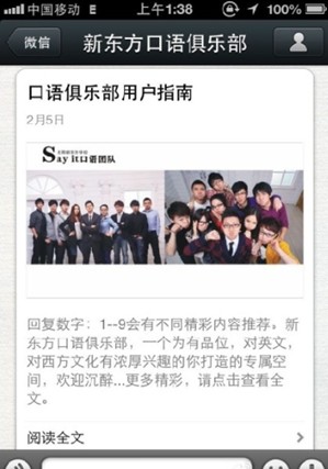 周一到周四会直接推送一分钟的《口语微课堂》。这个节目是由口语团队老师真人录制的,给大家讲解一些口语常用表达,周五偶尔搞搞互动,发发软广告,但是一定不能每天发广告,发一次广告就是对你微信粉丝的一次小伤害,广告多了,大家就烦了,会取消关注。所以广告一定要控制住,埋头做好内容。周六日我们会精选一些能引发朋友圈转发的双语趣闻,微信平台想要做大,一定是靠朋友圈的转发,从而用内容吸引更多的粉丝,有时一篇好的内容可以在朋友圈转发上2000+次。
