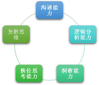 除了产品价值相关要素、运气成分等,销售行为效率与销售人员的自身能力正相关。一名优秀的销售人员,应具备沟通、逻辑分析、洞察、换位思考和发散思维五种能力(见图11.1)。其中,沟通能力是销售人员的基础能力,其他四种能力为进阶能力——每额外习得一种能力,对其销售能力都会有一个新的提升。