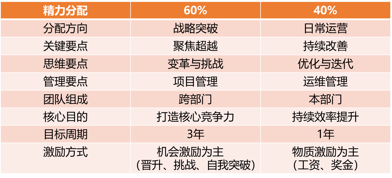 本案例是众多企业人力资源工作者的常态,作为组织发展的关键推手,人力资源一把手需要把组织冲突常态化理解为组织发展的关键特征。也就是说,如何把组织中碎片化的组织冲突通过建立各式的组织机制系统性解决。组织冲突的存在形态会在不同企业阶段、不同事项上存在不同的形态,如何有效应对,是我们需要持续研讨的话题。面对组织发展方向的问题,大部分人力资源管理者容易进入一个怪圈,日常运营救火花费的时间越来越多,甚至是95%以上时间,最后不到5%的时间也被身心疲惫影响无法聚焦突破,最后彻底沦为“保姆式”工作者,费力且不讨好。我们如何处理这种情况?在精力分配上,我们主张战略布局配置40%时间聚焦突破,日常运营配置60%时间关注持续改善。如表2-1所示。