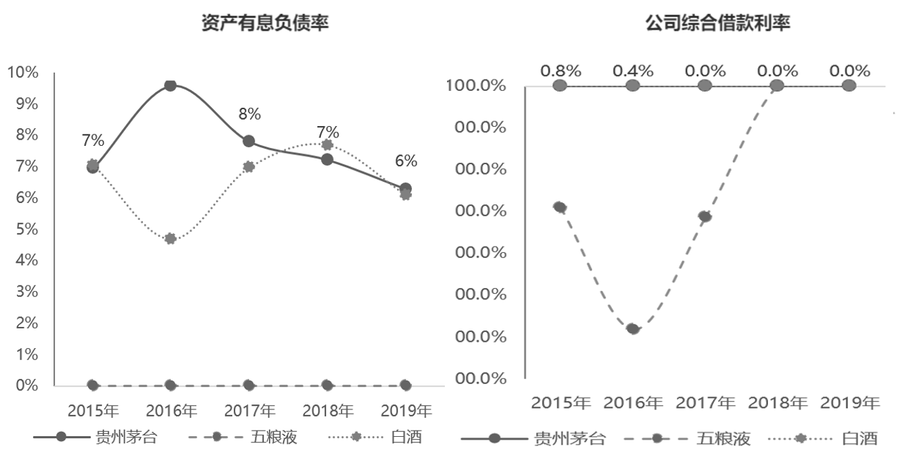 图8-18展示了贵州茅台、五粮液与行业平均在2015—2019年的资产有息负债率和公司综合借款利率。