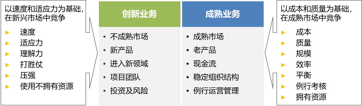 越是大型成功的企业,越是过分依赖过往的成功路径,不自觉给自己营造了茧房,对外部环境变化的感知变得迟钝,对客户的不满意声音变得无感,最终被客户抛弃,永远停留在了过去的旧时代。今天的成功反而成了明天成功的最大杀手。为了避免上述现象的出现,塔什曼和奥赖利三世提出领袖团队必须有能力同时管理好成熟业务和创新业务。成熟业务基于经过千锤百炼的技术和流程,以成本和质量为基础在竞争并获胜。创新业务的技术并不确定,其市场也在快速变化中,要想取得胜利,就必须以速度和适应力为基础。两种业务是截然不同的,企业若想成功,就必须建立成二元性的组织结构,能同时具备多种截然不同的一致性。二元性组织结构的特点,如图5-7所示。