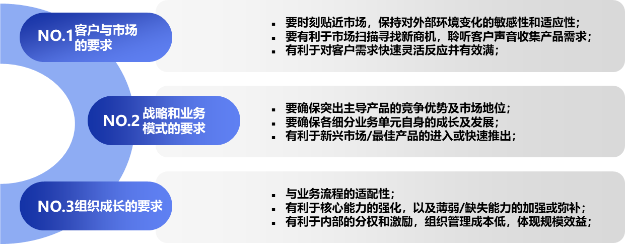 组织结构没有落后与先进之分,只有合适与否。无论何种类型的组织结构,只要企业需要在成熟市场和新兴市场中竞争,都要面临构建二元性组织的问题。所谓合适的组织结构,就是满足客户与市场的要求、满足战略和业务模式的要求、满足组织成长的要求。企业在进行组织结构设计时,一方面要遵循组织结构设计的三大原则,如图5-8所示,另外一方面也要了解各种组织结构的优劣,找到最适合本企业的方式。