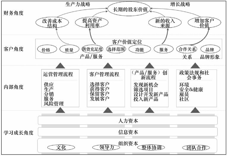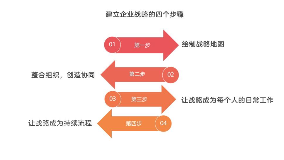 卡普兰开发了一套标准的战略地图模板,管理人员可以根据这个模板快速设计战略地图。战略地图可以让企业用通俗的语言来描述或用图标出与战略相关的目标、行动计划、衡量指标、目标值,以及这些因素之间的逻辑关系,通过战略地图,把战略分解为四个层次:财务、流程、客户和学习成长,帮助企业更好地实现战略落地的过程。
