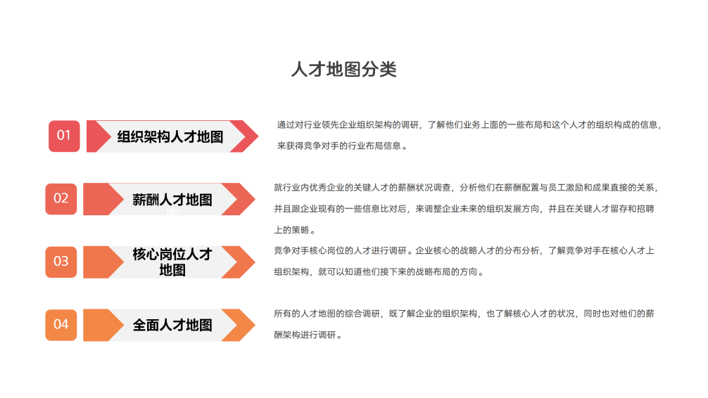 第二,薪酬人才地图。了解行业内优秀企业的关键人才的薪酬状况,知道他们的薪酬架构,并且把这些信息收集好之后,分析他们在薪酬配置与员工激励和成果的直接关系,并且跟我们现有的信息做对比,调整企业未来的组织发展方向,以及在关键人才留存和招聘上的策略。