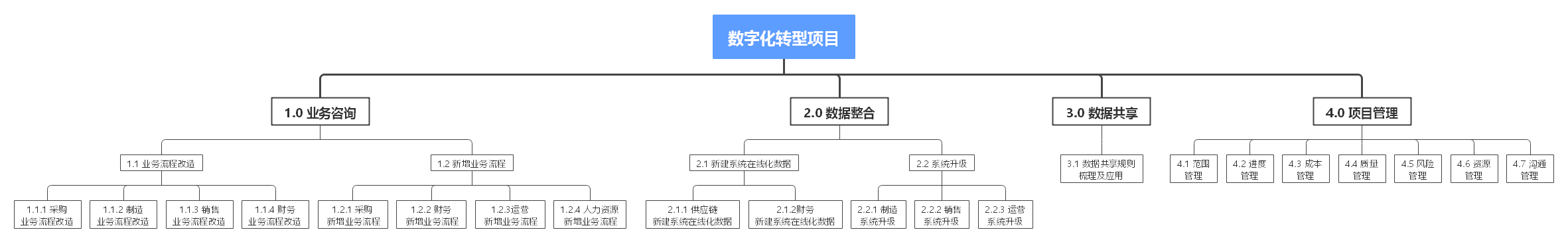 由于数字化转型的目标是基于数据来驱动业务升级。咨询公司的业务架构专家成泓建议从业务和数据两个维度进行工作拆解,因此罗宾在第一层,将任务分解为,业务咨询任务、数据整合、数据共享任务。第二层,从业务层面按照业务流程改造,新增业务流程拆解成工作任务;在数据层面上按照数据的来源,进一步拆解为新建系统在线化数据任务和升级系统任务。为进一步分解为可以执行的工作包,第三层拆解的过程中,由于每个部门需要推进的工作任务都非常类似,罗宾按照公司的部门进行分解,采购、制造、销售、财务、供应链、运营、人力资源等部门作为第三层的分解结构。罗宾同时提出要求每个部门都要有相应的项目组成员负责,要确保每个工作任务包能够在两周内完成,有利于后续项目细颗粒度的管理。