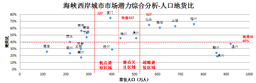 市场潜力从常住人口和地货比两个维度考虑,地货比较低且人口规模相对较大代表市场潜力较大。战略进驻区域城市共3个,分别为温州、泉州、赣州;重点关注区域城市共0个;机会进驻区域城市共1个,为抚州。