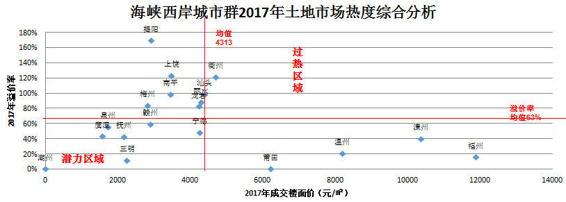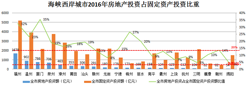 2016年海峡西岸城市群房地产投资额为6962亿元,占全国房地产投资额135284亿元的5.15%;房地产投资额在均值262亿元以上的城市有8个,分别是福州、温州、厦门、泉州、漳州、莆田、汕头及赣州。房地产投资占固定资产投资比重超过25%的有3个,分别为厦门、福州及梅州,此区域房地产投资相对过热,建议谨慎拿地;介于15%至25%的有5个,分别为温州、丽水、汕头、泉州、莆田及漳州,此区域为房地产合理投资区,建议重点关注;在15%以下的城市有12个,此区域房地产投资相对较少,存在潜在投资机会。