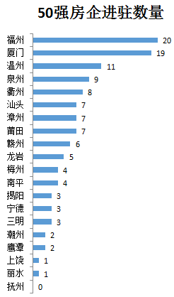 福州、厦门及温州等城市TOP50房企进驻较多,市场竞争十分激烈;7个城市已经有5家以上TOP50房企进驻。