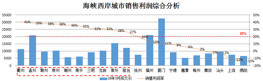 从销售利润率看,大于25%的城市有10个,为衢州、温州、赣州、泉州、潮州、南平、三明、龙岩、漳州及丽水。销售利润率=(房价-地价-土地外成本-增值税)/房价,土地外成本按3600元估算。增值税=(房价-地价)*10%/(1+10%)-3600*8%。需要注意的是:销售价格为2018年4月份价格,楼面价为近6个月成交楼面价,北京、天津土地外成本按5500元/㎡测算。