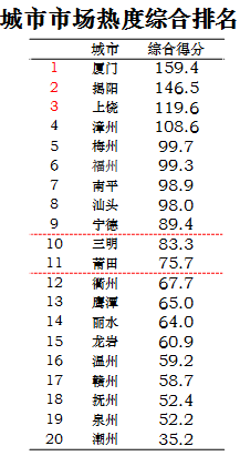 海峡西岸城市群城市市场热度综合排名TOP3的城市为:厦门、揭阳及上饶。