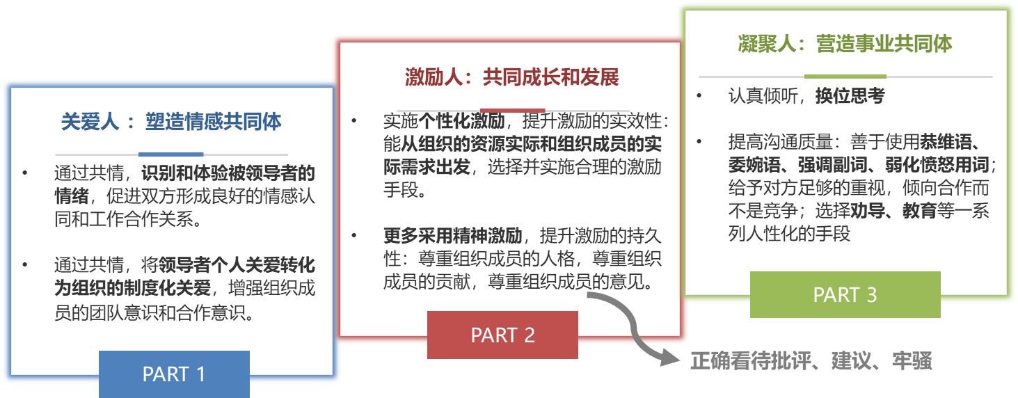 关爱人是指塑造情感共同体,通过共情,识别和体验被领导者的情绪,促进双方形成良好的情感认同和工作合作关系,将领导者个人关爱转化为组织的制度化关爱,增强组织成员的团队意识和合作意识。关爱人具体表现为感受同事的所想所及所盼,拉家常似地关心一下对方——“老人身体怎样,孩子学习如何,工作有什么困难”,还可以将关爱人形成制度化,比如爱心基金、茶话会、团建聚餐、分享机制等。
