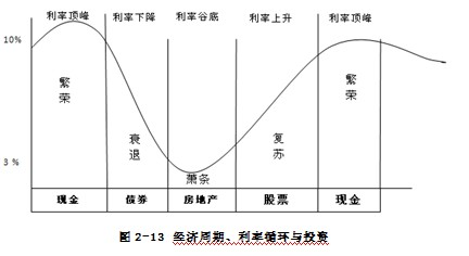 (2)衰退阶段.经济开始从顶峰下降,通胀还在上升,这个阶段消费者期望降低,工业生产下降,企业盈利下降,利率开始下降,持有“债券”是最佳选择。
