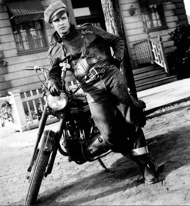 马龙·白兰度的《飞车党》中驾驶机车的浪子造型,成为叛逆的标记。皮夹克、紧身牛仔裤、白色 T恤、黑色手套和皮靴,至今都是哈雷行头的主要风格