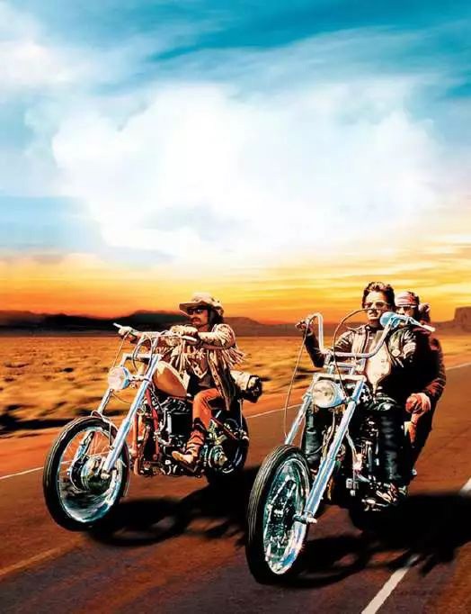1969年美国上映的《逍遥骑士》讲述了两个年轻人完成毒品交易后,身穿皮衣开着哈雷摩托横穿美国大陆的故事。