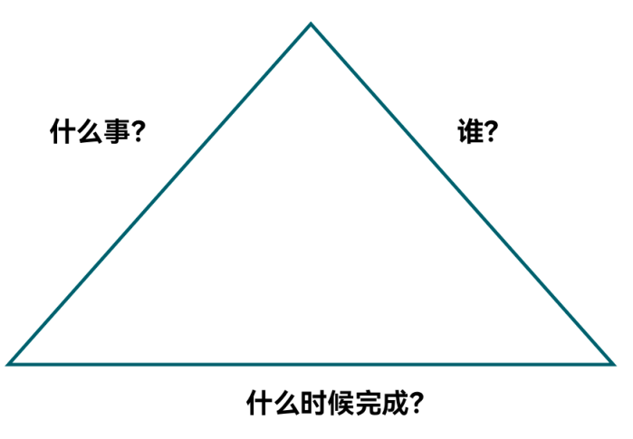面对这个坑有三个行为改变的建议:第一,使用“行动三角”这个工具。三角形的三条边分别是行动计划的3个重要因素“谁”“什么事”“什么时间”。如图5-2所示。