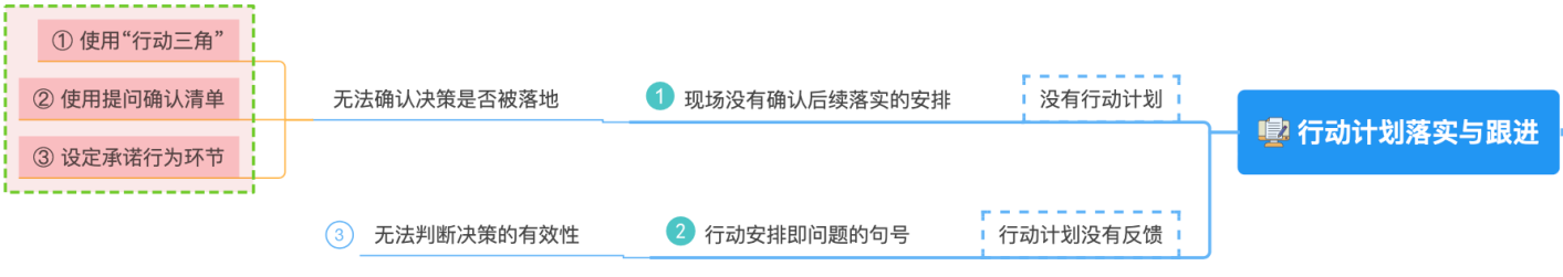 在会议中,当我们的决策没有相关的行动部署安排,被一些话语草草结束时,我们其余参会者或者主持人一定要及时站出来,通过提问确认这些行动的重要因素。以此确保我们的“行动三角”是完整的,相关重要行动节点在会议现场得到相关人员承诺并会坚决执行的。