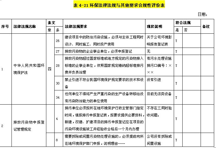 合规性评价的证据要留下来。具体如表4-21所示(都是同一个内容,到时续表,不一个个列出序号)。