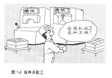 ·培养多能工,即1人能操作多台设备(或多个工序),才能按生产量的变化随时进行人员增减(图7-9