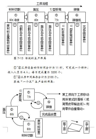 图7-13是实施“一个流”前传统的生产布局: