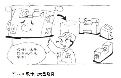 当要生产大量的产品时,大型设备或许仍是适当的。不过在什么都能做的通用型大设备旁边,常常可看见积压了一大堆的在制品,使生产的流动不顺畅。市场的趋势已经走向多种少量,生产线也必须走向细流而快的复数生产线化,才能更有弹性的应对市场的需求。所以,机器设备的需求,也应改变成小型化,速度不快,但品质很稳定,故障率也低,这才是较好的机器设备,不要再迷恋速度愈快,才是愈好的设备这种传统的想法。