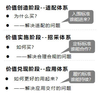 从采购升级到供应链全新模式的价值协同,在价值创造阶段,侧重于打造适配体系;价值实施阶段,侧重于打造采购体系;价值兑现阶段,侧重于打造应用体系。如图4-2-4所示。