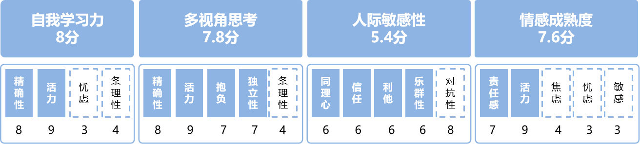 进一步分析发现,吴昊的高潜因素中优势占上风,同时也存在轻微的劣势。优势体现在:自我学习力、多视角思考和情感成熟度得分均较高,分别为8.0、7.8、7.6分,说明其快速学习和分析能力强,具有较好的创新意识,同时自信乐观,能够正确看待挫折与压力,不断提升自我和成长。这些潜质非常有助于他在海外市场拓展中多方位思考问题、根据多样化信息快速制定决策,灵活应对各种不明朗的局面和解决棘手的问题。而劣势体现在:人际敏感性相对较低,为5.4分,并且从他的下级、同事反馈中也能反映出他在团队合作中存在一些小问题,说明其可能在理解他人、聆听他人等人际沟通方面有所欠缺,不善于觉察他人的感受,倾向于坚持自己的想法,具有竞争性。这对于团队凝聚力和跨地域、跨文化沟通合作可能存在一些隐患,不利推动团队工作开展,需要稍加关注和引导。事实上,吴昊的这些特点都是从他的性格中体现出来的,大五性格测评结果显示他是一个非常具有活力,精确性、对抗性和独立性较高,情绪性(焦虑、忧虑、敏感)较低的人,而宜人性(同理心、信任、利他)一般。