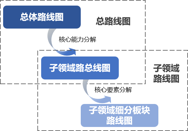 汽车企业数字化转型路线图包括三个组成部分,分别是总体路线图、子领域总路线图、子领域细分板块路线图,三部分逐层向下拆解,如图5.2。