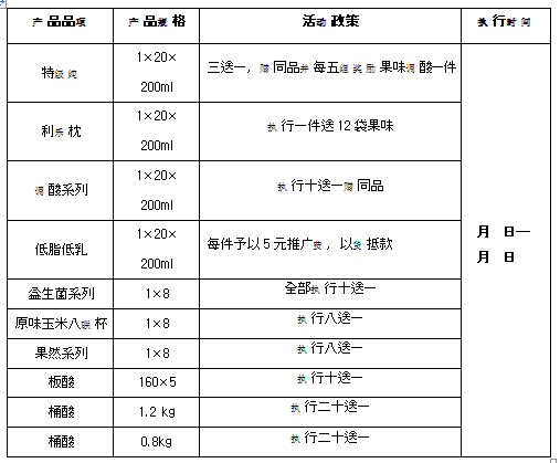 (1)××市场终端实物陈列(以三件调酸两件特级为标准)。计划:计划150店每两个月调酸一件,合计300件调酸,签协议,执行一月返还一次。