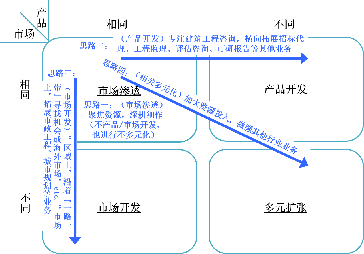 对于K公司,项目组认为K公司一个重要战略命题是如何利用公司的品牌、客户资源为其他业务创造价值?项目组借鉴“安索夫矩阵”(如图10-1所示),向公司提出可以有四个思路。
