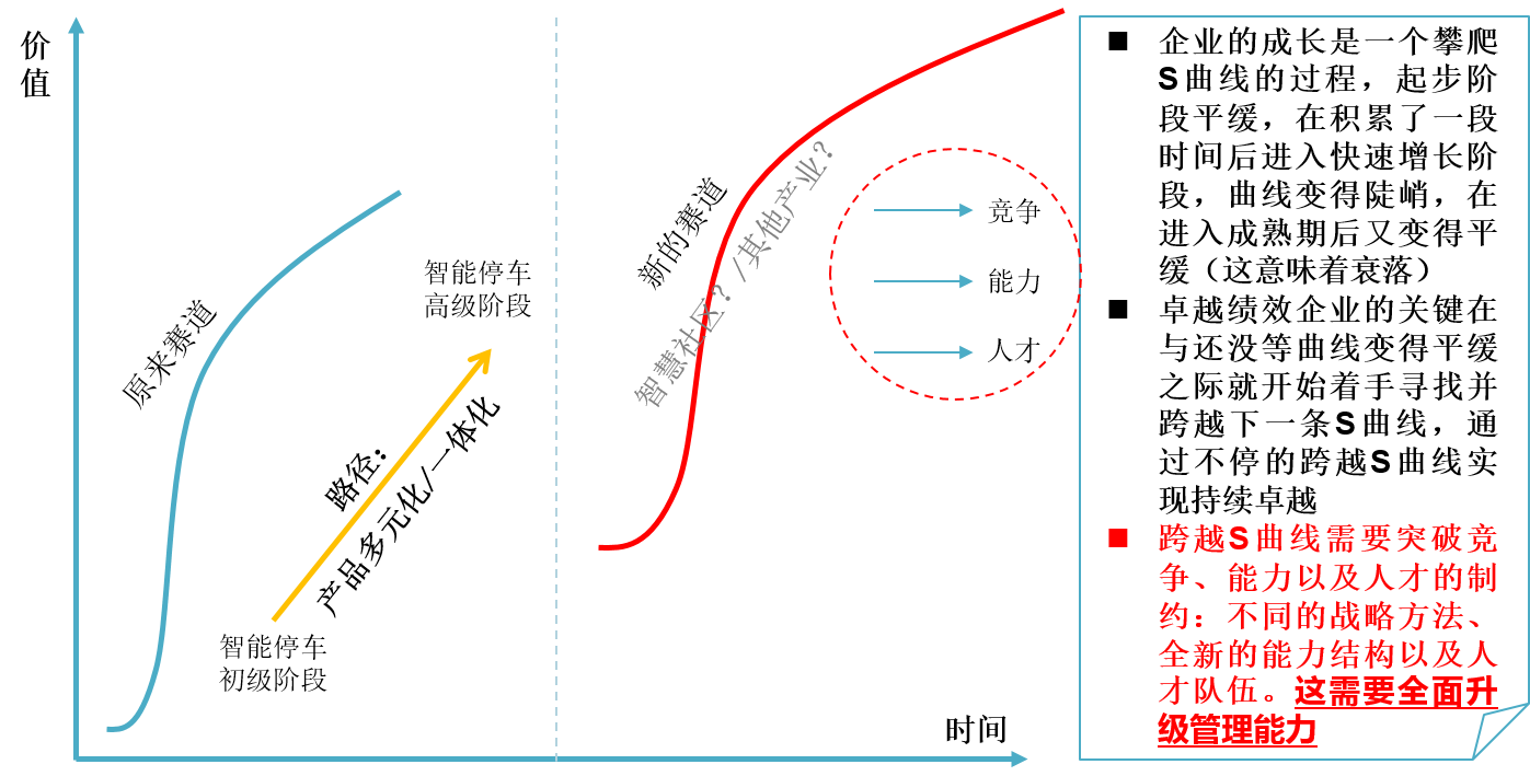 《创新的扩散》《进攻者的优势》《跨越S曲线》等书讲述了同一个理论:S曲线。西方理论届对“S曲线”理论研究的时间很久。笔者认为,企业战略的两个主要问题可以用S曲线解释(如图10-2所示):一是企业如何从现有位置攀登到发展的S曲线顶端;二是在接近S曲线顶端之前找到“第二曲线”从而实现二次增长。很多企业遭遇“成长中的烦恼”,都是源于没能找到下一条发展曲线,甚至往往把企业的战略问题误判为经营问题。中国很多企业发展困境都是体现在这里。张瑞敏有句话说的很对:企业最大的战略就是寻找“第二曲线”,即企业“新的生路”。