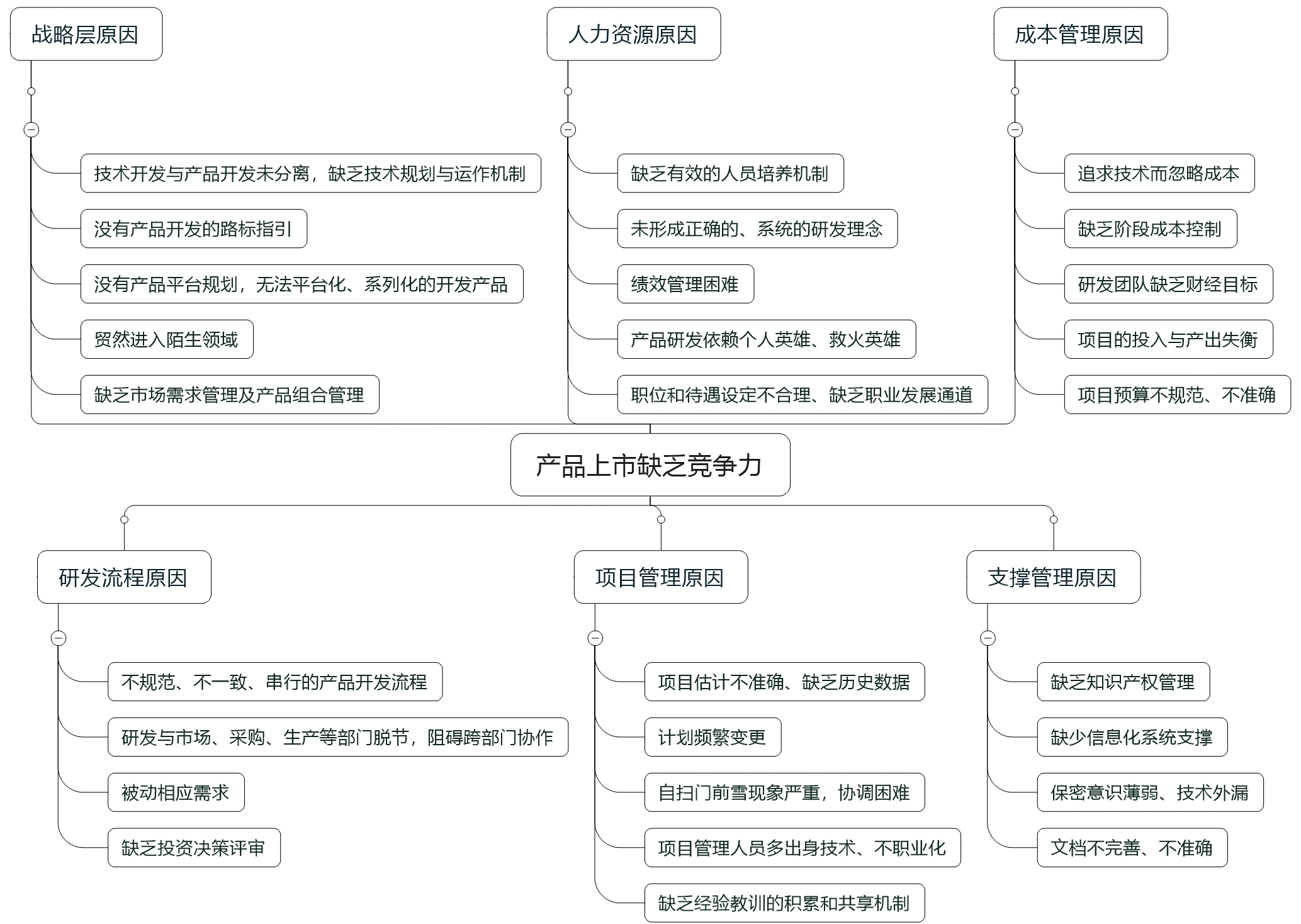 简洁的处理手段就是将这些信息分类,并将类似信息再归并到一个类别上,这样可以迅速让我们的思维聚焦。可以将研发体系划分为典型模块,比如产品战略、研发团队技能、技术积累、研发管理体系;对管理体系进行分析时,又可以划分为研发流程体系、绩效管理机制和研发组织模式;如若对研发流程体系的问题进一步剖析,又可以关注产品规划流程、产品开发流程、研发项目管理机制等。