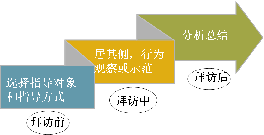 拜访前:选择指导的对象和指导的方式,现场指导不要超过两个人,也就是完全一对一的指导。一般来说,应该提前通知被指导者,不过偶尔一次的临时通知也许能发现一些没有注意的情况。同时也要清楚地告诉被指导者你此次现场指导的角色是观察者还是示范者;本次拜访的目标是什么;如果你是观察者,你要问销售人员本次拜访的目的是什么;当你询问下属将要拜访的客户的姓名、职务、与竞争对手的关系、准备介绍什么产品、个人爱好等,总有些人是不能回答准确的,应当向对方指出拜访准备不足开始就有问题。