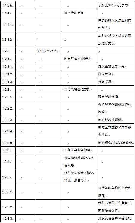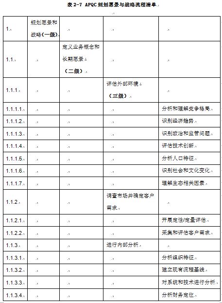 对于每一个一级流程,APQC都给出了细到第三、甚至是第四级的流程架构。以“规划愿景与战略”一级流程为例,APQC2012年V 6.0.0版流程清单如表2-7所示。