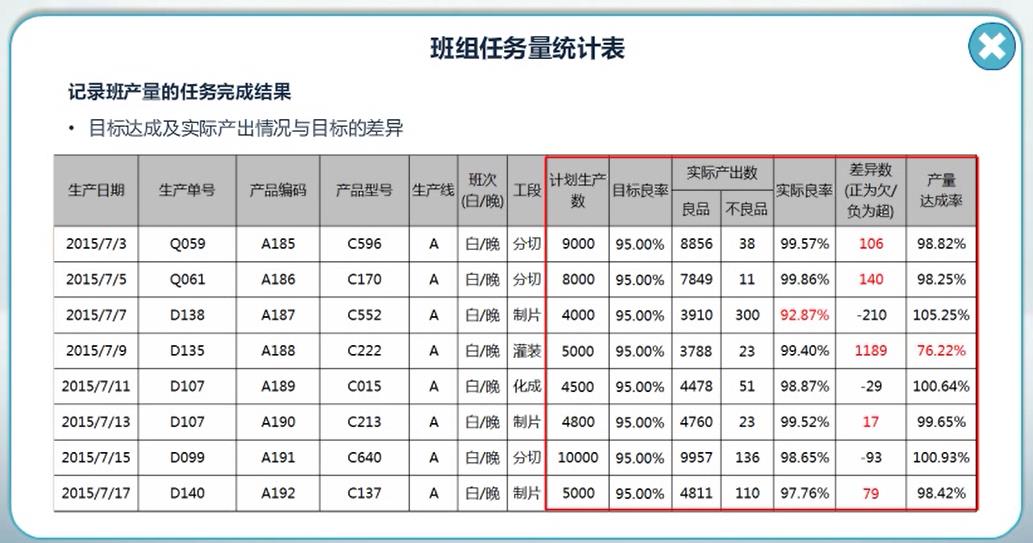 记录班组产量的任务完成结果,体现目标达成及实际产出情况与目标的差异。