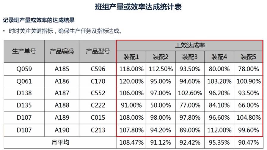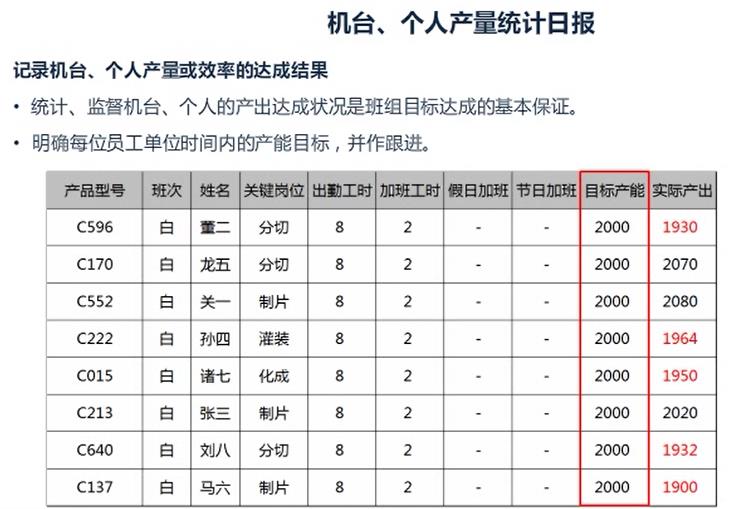 记录机台、个人产量或效率的达成结果;统计、监督机台、个人的产出达成状况是班组目标达成的保证;明确每位员工单位时间内的产能目标,并跟进。