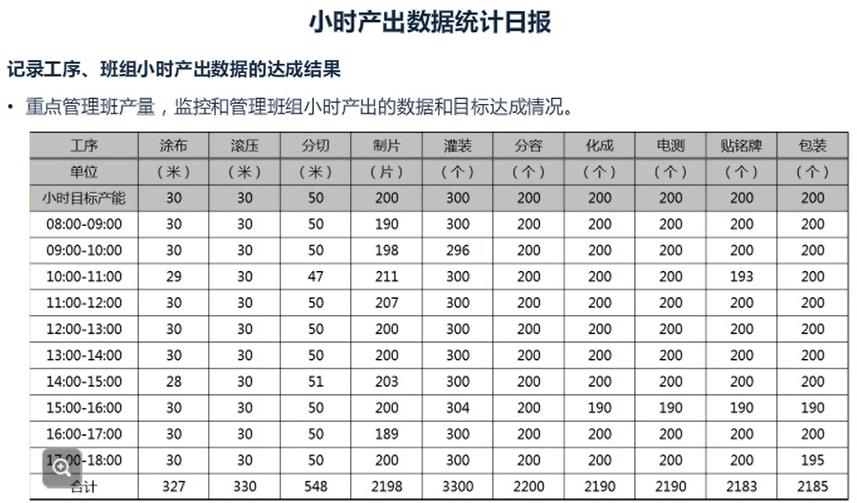 记录工序、班组小时产出数据的达成结果;重点管理班产量、监控和管理班组小时产出的数据和目标达成情况。