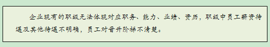 :所以,将规范后的各部门管理职务的任职条件、管理范围及在公司与部门组织中发挥的功能等逐一分解。依据公司实际状况,项目组与人力资源部、公司高管多轮分析、解说与讨论,将公司从员工到总经理共划分为16个职等,从而满足了组织的阶梯层级激励,支持员工的晋升与职业发展,彻底破除了因人设岗、人员流失、管理团队老化、管理效率低下的问题。