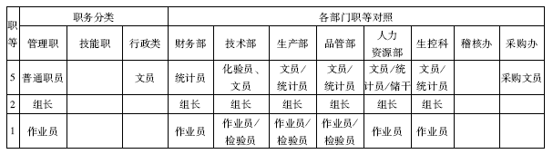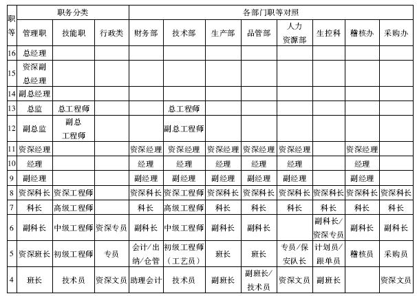 :这张表显示职务分类有管理职、技能职和行政职这三大类,从员工一直到总经理级总共划分出16个职等。