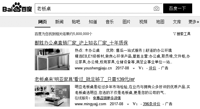 图3-25 在百度搜索“老板桌”时,搜索结果前两位广告