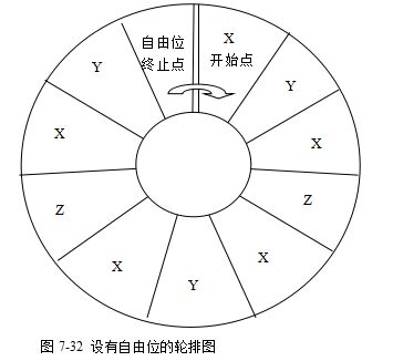 在品种XYZ以 50%30%20%的比例进行生产时,在同一条流水线上可以使用图7-31所示的轮排图进行生产排程。这样的排程是理论上可行的,但在实际生产时,可能会发生延迟的情况,所以很呆板地按照这样的方式进行生产的话,一天未必能生产出100个。为了增加生产排程的灵活性,可以考虑设置“自由位”。所谓自由位,就是没有指定产品的含义。例如,在轮排表上增加1~2格,视情况安排1~2个调整位(图7-32)。
