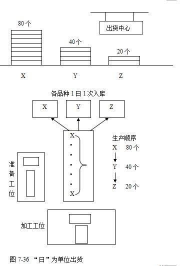 假如有XYZ三种产品,某月的生产要求分别为X1000个、Y600个、Z400个,那么按照传统的生产安排方式,生产计划会按表7-6及图7-29所示进行安排。即先将品种X生产完毕,再生产品种Y,最后生产品种Z。以月为单位进行排程。这种生产安排也称之为分段生产。在品种较少的情况下,此种生产计划或许可行。但在当今市场需求多样化的时代,仍然长期坚持此种生产安排将使企业经营陷入困境。这种传统的大批量生产的方法,可以节省作业切换时间。但是,会与市场需求出现很大的差异。因为一个企业的产品一般都有多个用户,每个用户对产品的品种、规格、型号、式样以至颜色的要求不同,要求交货的具体时间也不相同。按照需求的这种特征,企业应该在尽可能短的时间内(比如一天)提供尽可能多的品种。大批量的方法势必造成一部分产品一时供大于求,销售不出去,造成积压。同时,另一部分产品一时生产不出来,供不应求,发生缺货。这两种情况都造成损失和浪费,使企业丧失销售时机,失去市场。另外,从企业内部组织生产来看,批量大固然给组织生产带来一定方便,但会造成资源浪费。由于面临多品种生产,企业必然配备多种设备与多种技能的工人,准备多种原材料。如果一段时间只生产一种产品,会造成忙闲不均。在生产某一种产品时,可能一部分车间和设备超负荷运行,部分工人加班加点,某些原材料和外购件一时供应不上。相反,另一部分车间和设备负荷不足,甚至空闲,工人无事可干,某些原材料和外购件出现积压,造成浪费。过了一段时间,生产另一种产品时,闲的可能变忙,忙的可能变闲。同样会造成浪费。从表7-6中可以看出,X品种的产品通常会导致较长时间的库存(不仅仅指工厂的成品仓库),Z品种的产品大半个月无货可供应市场。