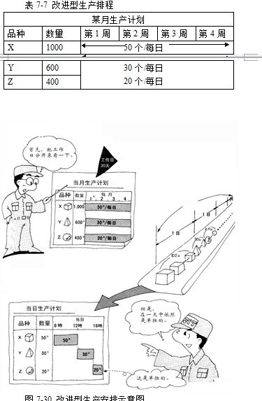 这种生产排程以天为单位,与传统的以月为单位的排程相比,其库存与满足市场需求方面都有较大改善。但是,从图7-30可以看出,在每日的生产安排中,仍然是分段生产,先生产品种X 50个,再生产品种Y 30个,最后生产品种Z 20个。
