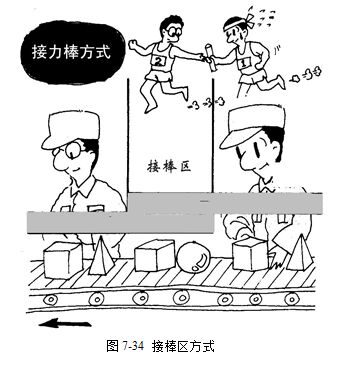 对组装生产线来说,各工序作业工时平衡是非常重要的,否则会造成大量的人力浪费。尤其是多品种少量生产的混合生产线,如何进行工位安排来保证生产线平衡,及合理地进行零部件供应是必须考虑的要点。不过,对于混合生产的组装生产线,各作业人员的工时经常保持一定是有困难的。为了维持工位作业的平稳性,常采用接力区方式与分支方式。所谓接棒区方式就是与田径比赛中的400米接力赛有交接棒区一样,在组装线上的2名作业员之间也定有“接棒区”(缓冲区),从而扩大了交接范围(图7-34)。当前工序的作业员发现其产品已经流到“接棒区”的时候,就须告诉下工序作业人员,请求支援,帮助完成工作。所以,作业人员必须训练成多能工,并建立相互支援的共识,以此应对品种的变化。因此,即使进行品种切换时也能够保持生产线平衡。
