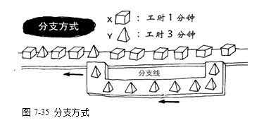 所谓分支方式,就是对超出“正常生产排程”(相对通常的情况而言)的部分,通过设立分支组装线来进行消化的方式(图7-35)。例如:产品A10个零件要进行组装,而产品B则需要组装18个零件,这两种产品的组装标准工时可能不一样,但是产距时间仍然必须相同,解决的方法就是设立分支组装线,将不同产品超多的作业量之作业分出来在分支组装线上进行生产,直到正常作业量部分再返回正常的生产线内。当然,在分支组装线上也必须配置作业人员来进行生产。如此,并没有对原来的生产线上的人员构成什么影响。即生产量的变化没有影响到原生产线的平衡状况。