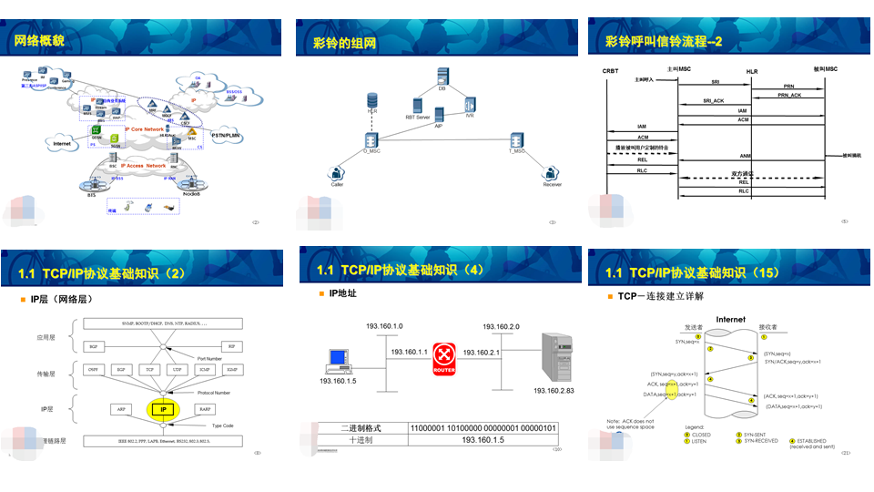 各大通信运营商为了提高前端销售和客服人员服务客户的专业水平,常常会组织一些基础网络技术专业知识类的培训。以下是普遍出现的PPT教材中极为典型的课程内容(如图1-8所示)。