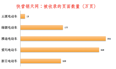 经过大数据研究发现,在天网的体系里面,雅迪电动车有400万个网页在报道他的产品和品牌。爱玛电动车有328万个网页,新日有169万个网页,王派只有18万个网页。
