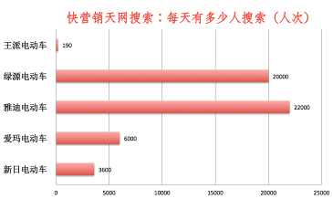 我们接着来看,每天有多少人搜索这些企业、搜录这个品牌的关键词呢?研究发现,每天有22000人在搜索雅迪电动车,而新日电动车每天只有3600人在搜索。我们知道,一个品牌非常强势,在有很多人知道的情况下,当这些人想购买、了解它的产品的时候,一定会发生一个动作,就是搜索这家企业,查查它的品牌,查查它的相关信息。我们知道,在搜索引擎的世界里,就是搜索品牌关键词,引起销售和购买,这是一个营销行为模式。