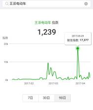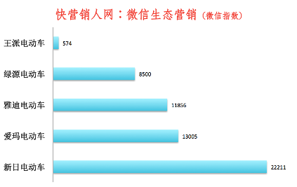 我再一次研究人网领域,在微信生态营销领域,对手到底做到什么情况?我是使用了微信指数这个指标来看。我发现新日电动车在这个领域做得最好,微信指数为22211,这并不代表仅22000个人看见,而是品牌在微信社交平台中的曝光度。而王派微信指数是574。爱玛电动车是13005,雅迪电动车是11856,绿源是8500,所以在微信生态营销里面,你会发现王派做的也很落后。